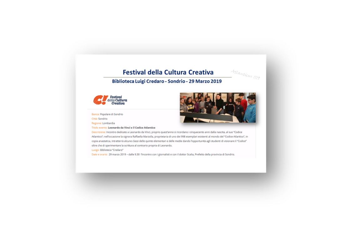 E' cominciato così, e negli anni ho condiviso il Codice Atlantico di Leonardo in parecchi eventi di cui trovate di seguito la cronologia, in tutti ho curato in prima persona l'allestimento e sono sempre stata presente per spiegarne il contenuto ai visitatori, arrivando persino a costruire le cornici in legno più adatte a contenere i Fogli...